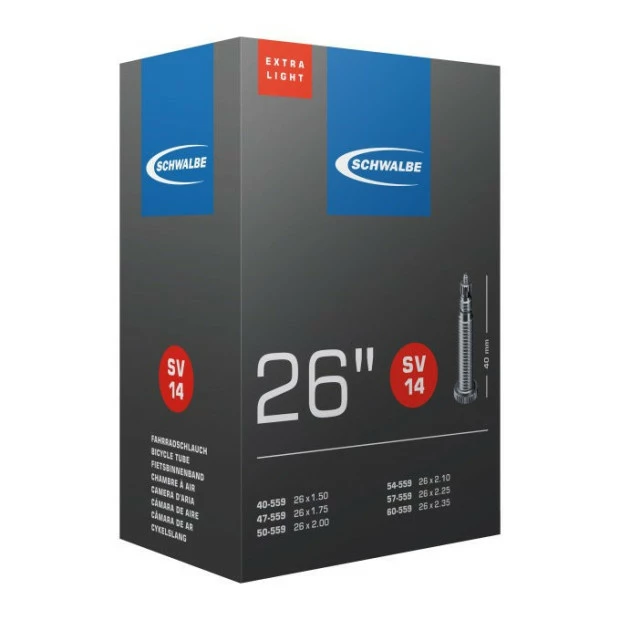 La chambre à air Schwalbe SV 14 Extralight est une chambre air idéale pour les VTT de 26″.